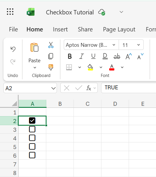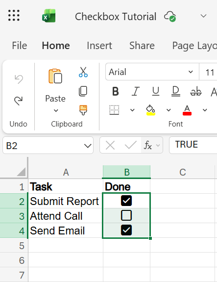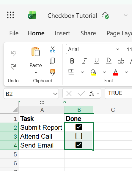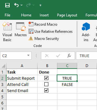 - Now, the linked cell shows TRUE when checked and FALSE when unchecked.