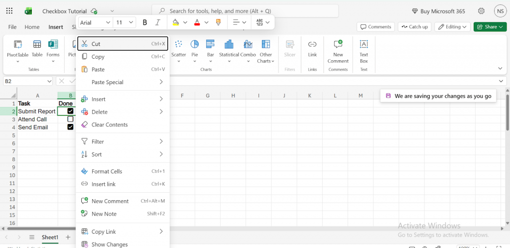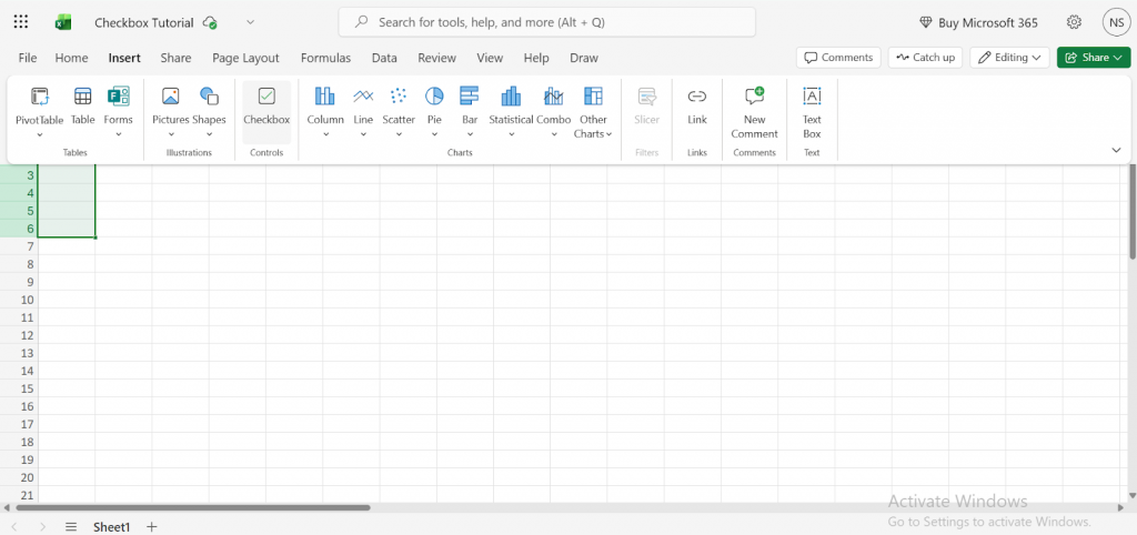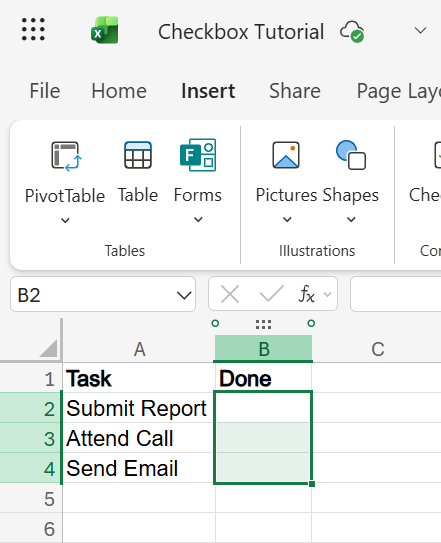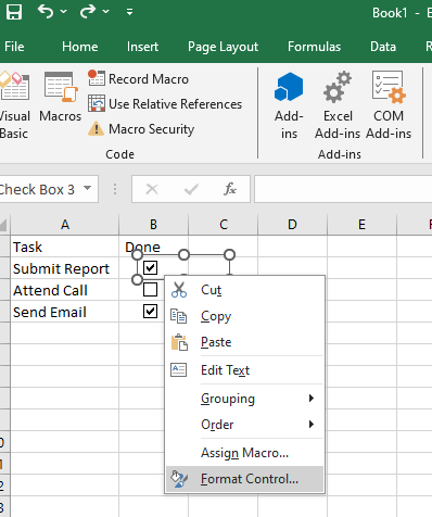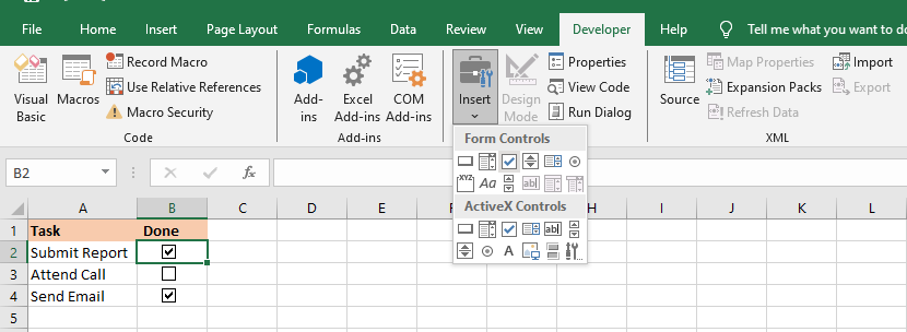 - Click Insert, then choose Check Box (Form Control) from the Form Controls section.