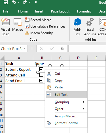 - Right-click the checkbox > Edit Text to change or delete the default “Check Box 1” label.