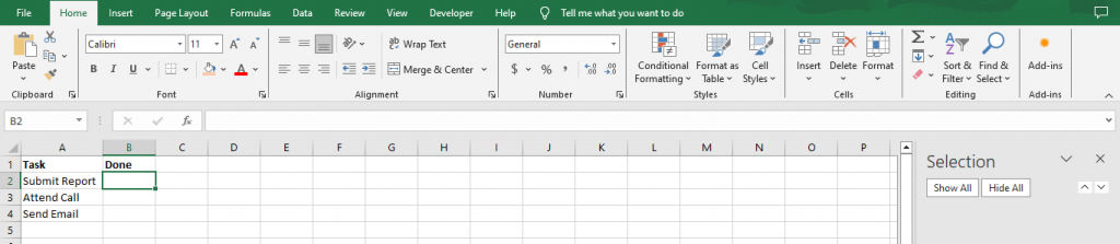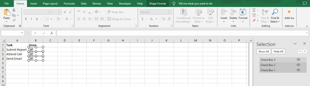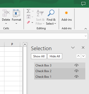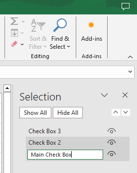 - If you’re using Form Controls, rename checkboxes via the Selection Pane: