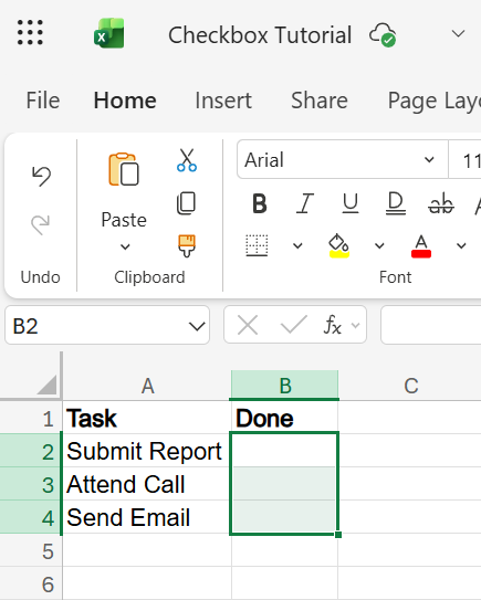 - Click anywhere on the worksheet to insert the checkbox, as we have added it in column B