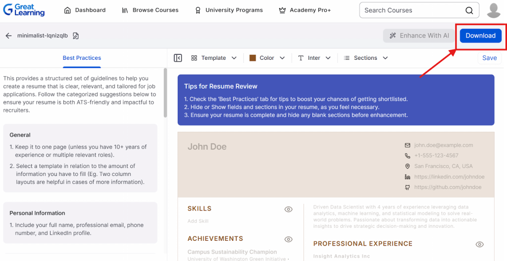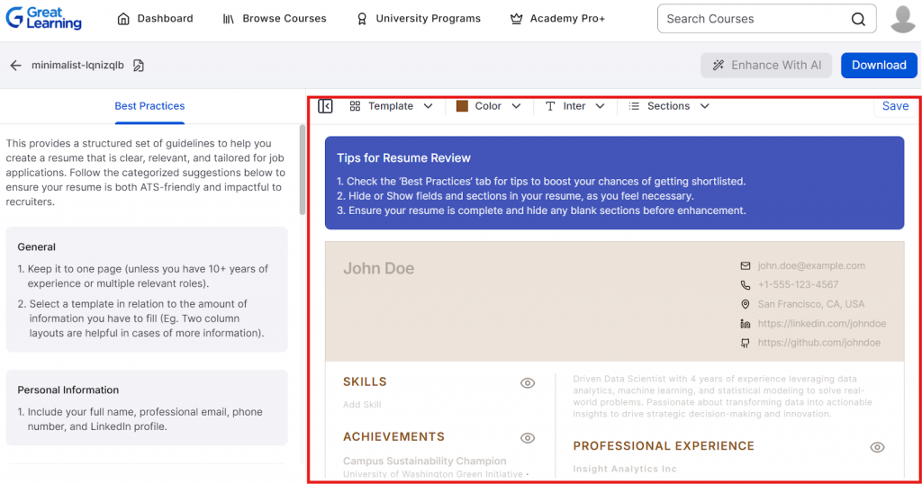 Great Learning claims that most users can complete their resume in under 15 minutes. This speed is made possible by:
