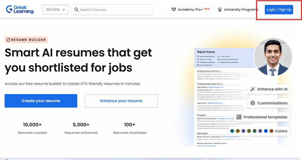 With many resume-building tools available, it can be challenging to choose one. For those looking to build a professional, ATS-friendly resume quickly, one option is Great Learning’s Resume Builder. It’s an advanced AI-based tool designed to help you create an ATS-friendly resume that not only looks great but is also optimized for ATS.
