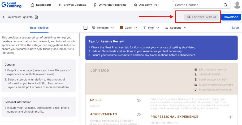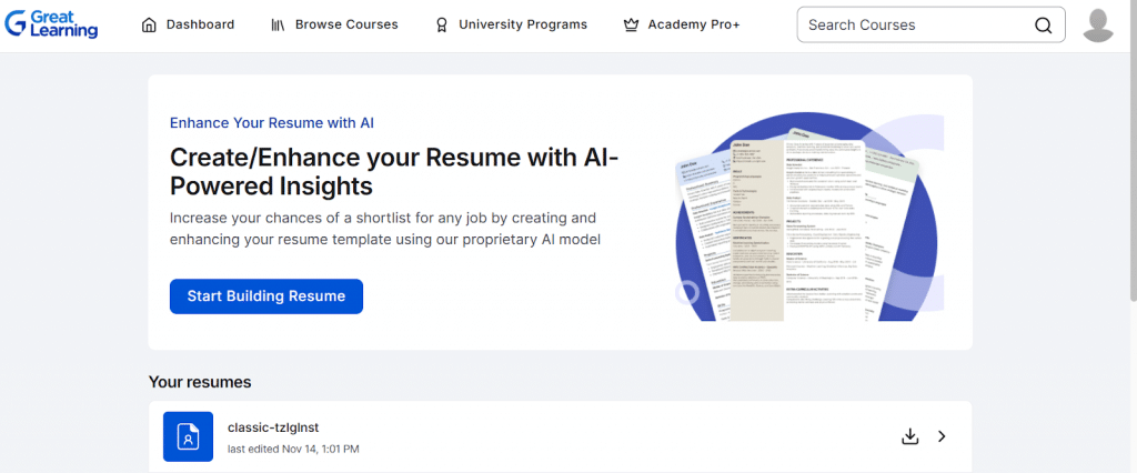 - Go to the AI Resume Builder page on Great Learning Academy Pro