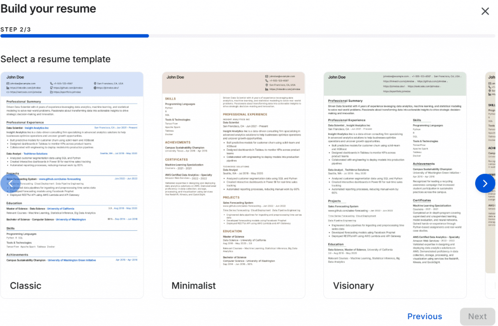 The tool offers a variety of pre-designed templates that are optimized for ATS. These templates ensure that your resume has the right structure to be read by both the ATS and a recruiter. You can choose from styles like: