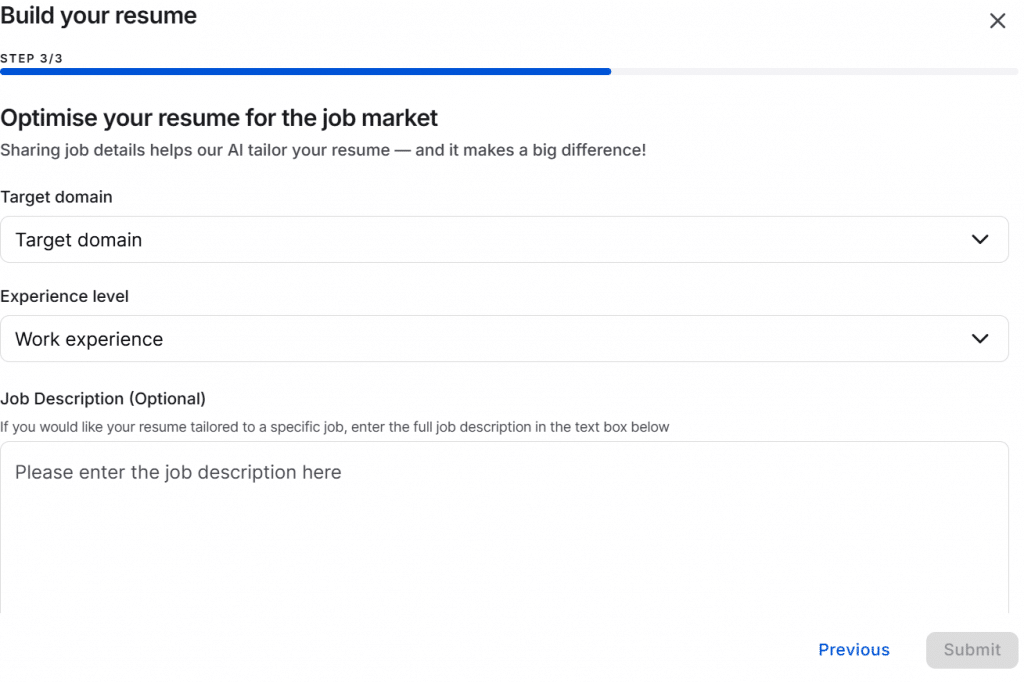 The builder adapts based on your years of experience and the domain you’re targeting (e.g., data science, marketing, software development). It allows you to: