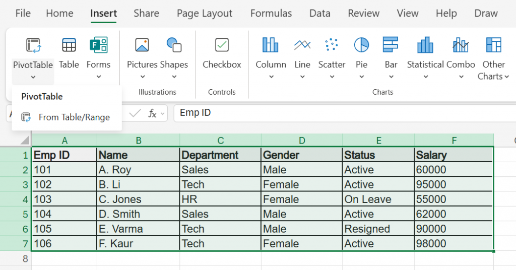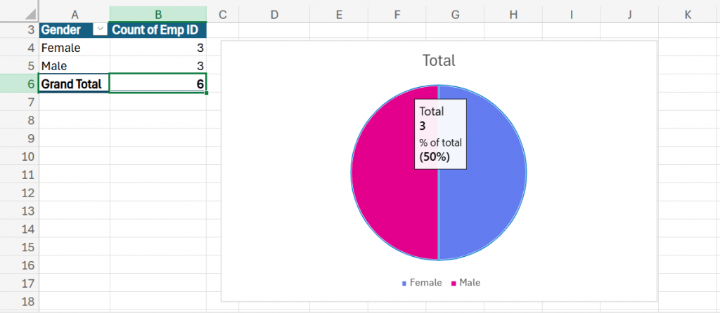 - Click inside your Pivot Table and go to Insert > Charts > Pie Chart (or "Doughnut Chart"). This creates a visual snapshot comparing the portion of Male vs. Female employees.