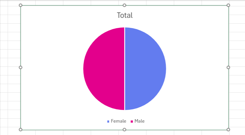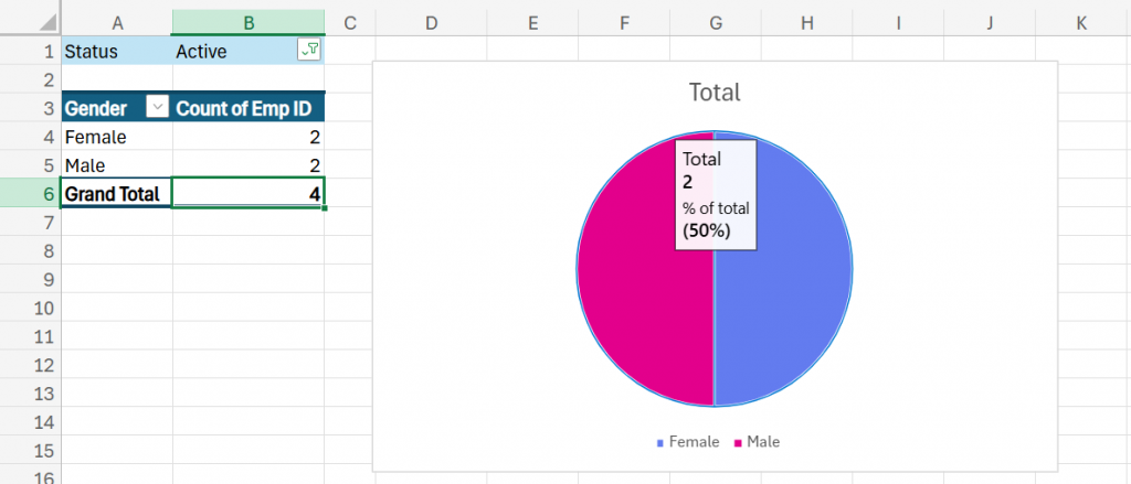 - Verify the Result: Your chart may still look like a 50/50 split (because the remaining staff is equal: 2 Males, 2 Females).