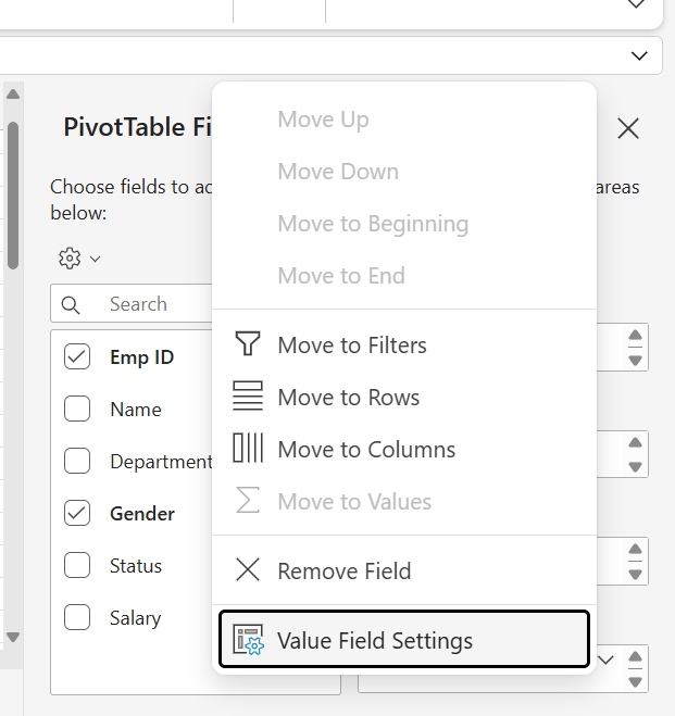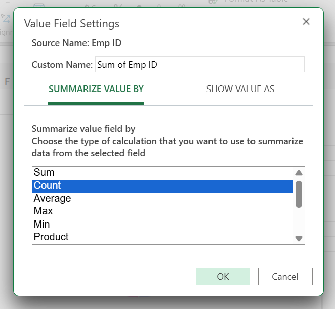 - Important: Since the Values area shows ‘Sum of Emp ID’, we need to change it to ‘Count’. To do this, click on it > select Value Field Settings > choose Count > click OK.