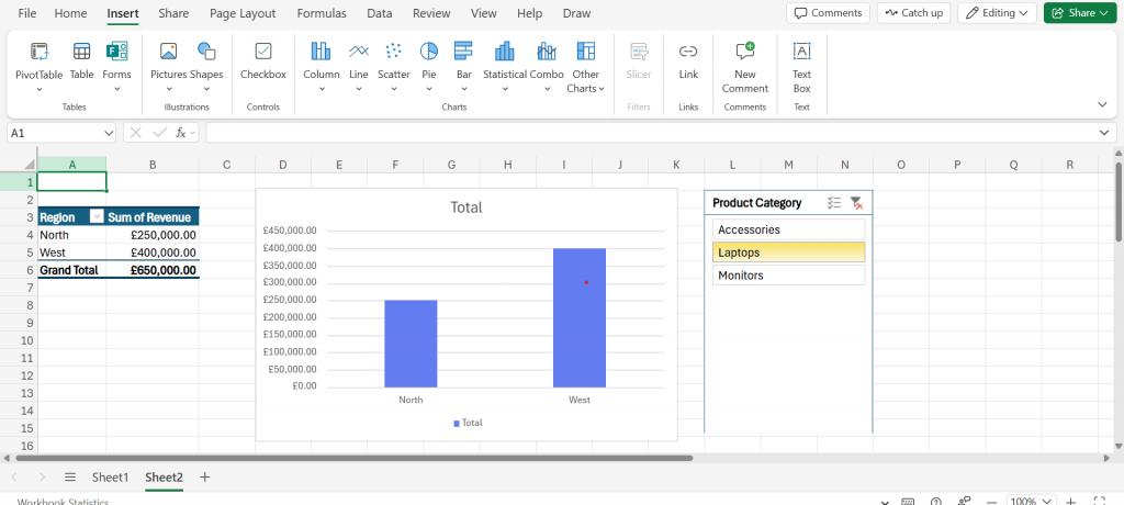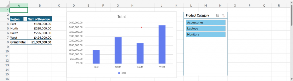 Click "Laptops" in the Slicer. You will see both the Table and the Chart instantly update to show only the revenue from Laptops, hiding all other data.