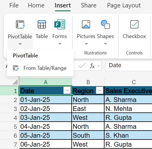 - Go to the Insert tab on the top ribbon and click PivotTable.