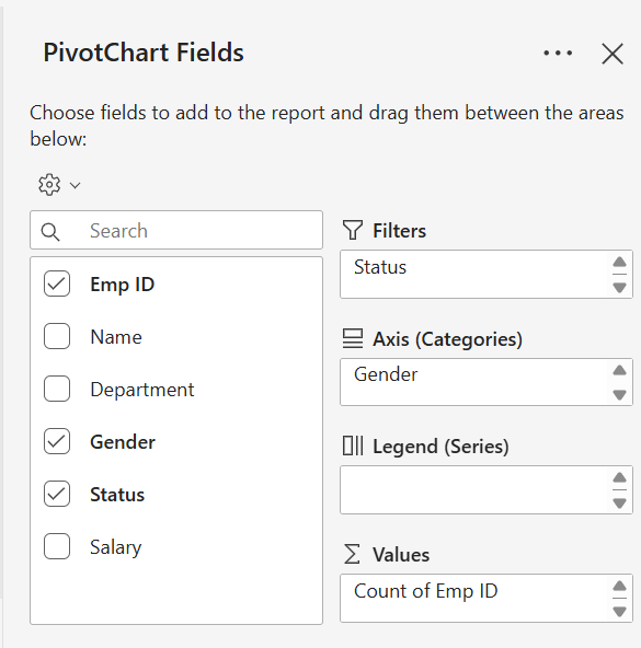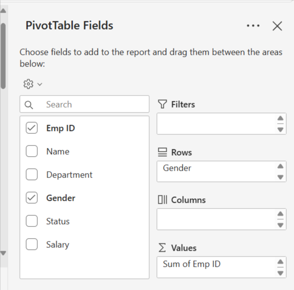 - Drag Gender into the Rows area and Emp ID into the Values area.