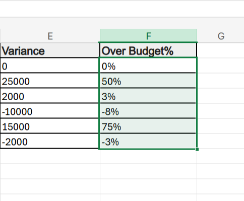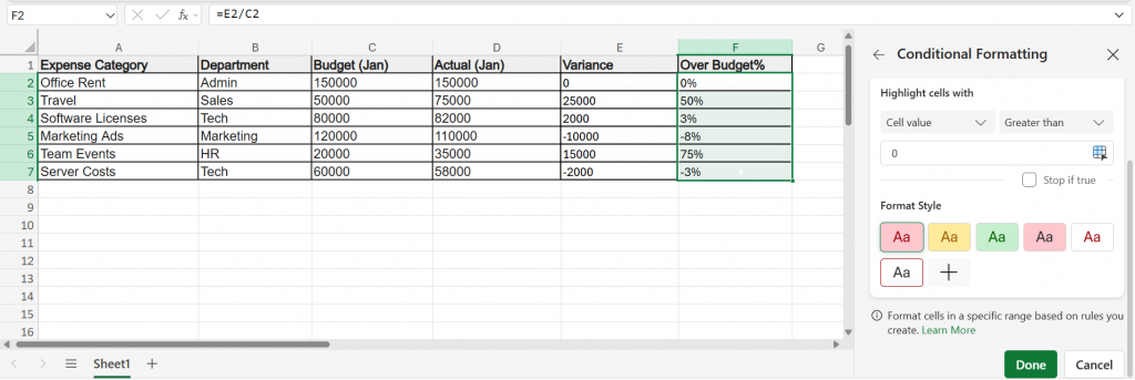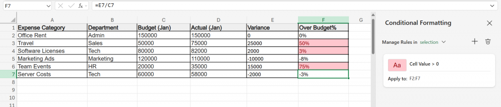 Result: Cells that show a positive percentage, meaning the spending is higher than the budget, will automatically turn light red with dark red text.
