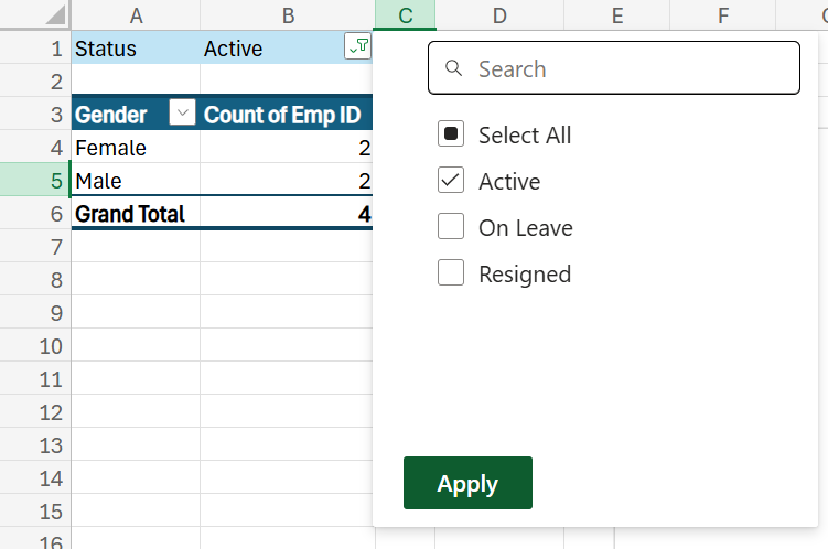 - The Matrix: You have a clean summary table showing exactly how many Active Males and Females are in the company.