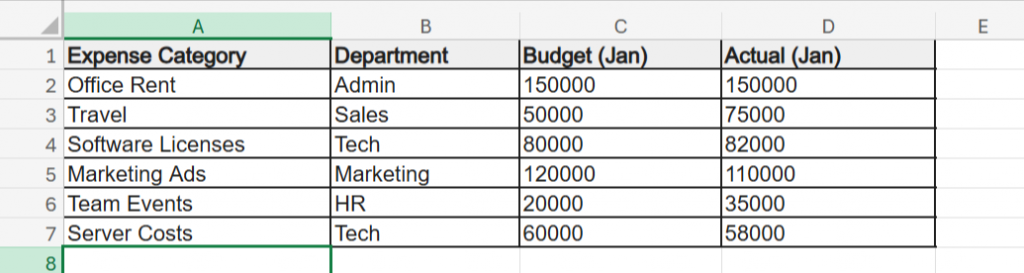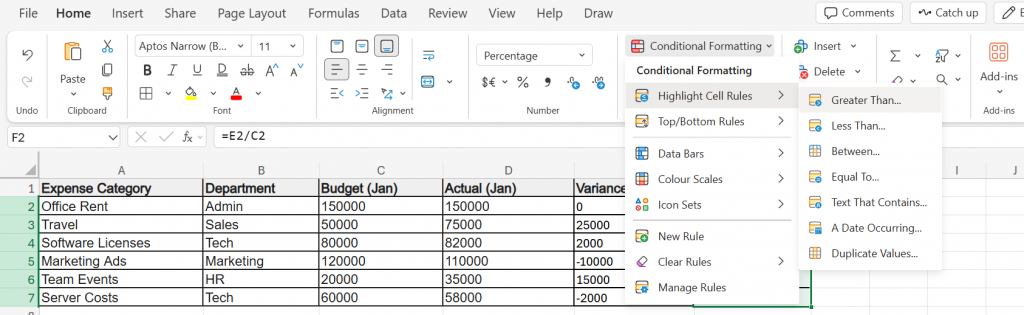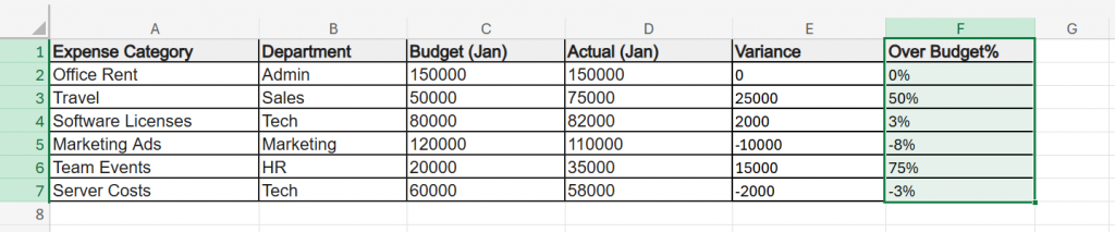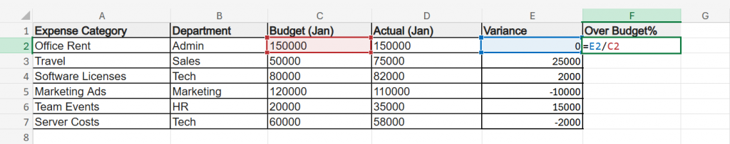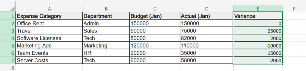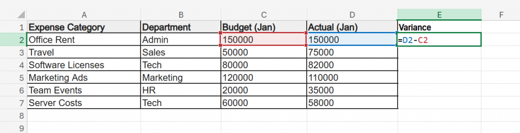 - In cell E2, enter the formula: =D2-C2 (Actual minus Budget).