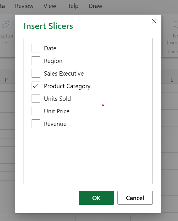 - Click Insert Slicer and check the box for Product Category, and click OK.