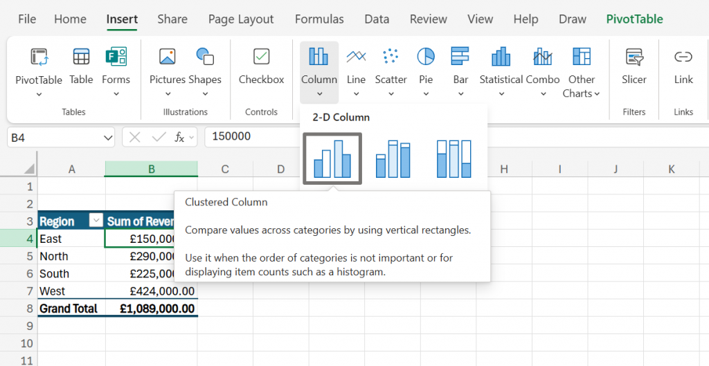 - Go to the Insert tab and select a Clustered Column Chart (the first option under 2-D Column).