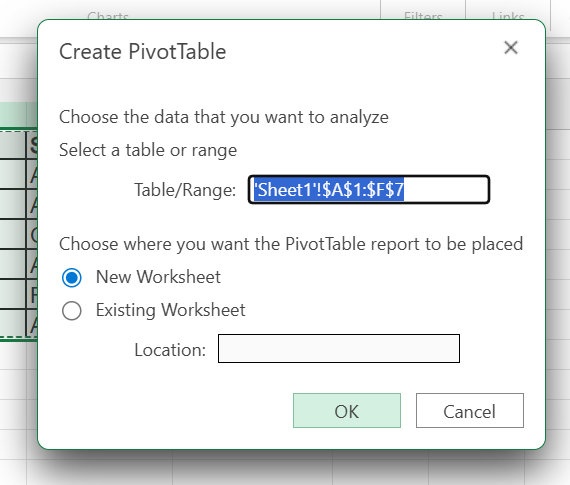 - Select the data (A1:F7) and go to Insert > PivotTable > New Worksheet > OK.