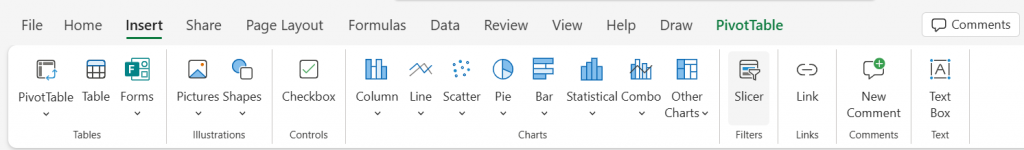 - Go to the PivotTable Analyze tab on the ribbon (or the Insert tab if using Excel Online) and click Insert Slicer.