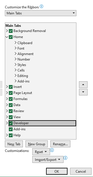 - On the right side, under Main Tabs, locate and select the Developer box and click OK to save your changes.