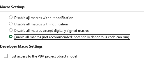 | Enable all macros (not recommended) | All macros are enabled by default—use with extreme caution. |