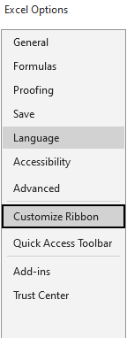 - In the Excel Options dialog, select Customize Ribbon from the left pane.