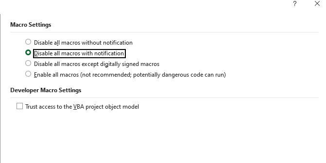 | Disable all macros with notification (Default) | Shows a security warning and lets you choose whether to enable it. |
