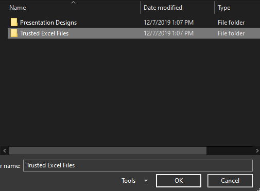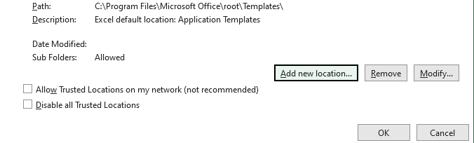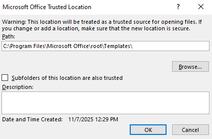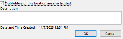 - Optionally check “Subfolders of this location are also trusted” and click OK to confirm.