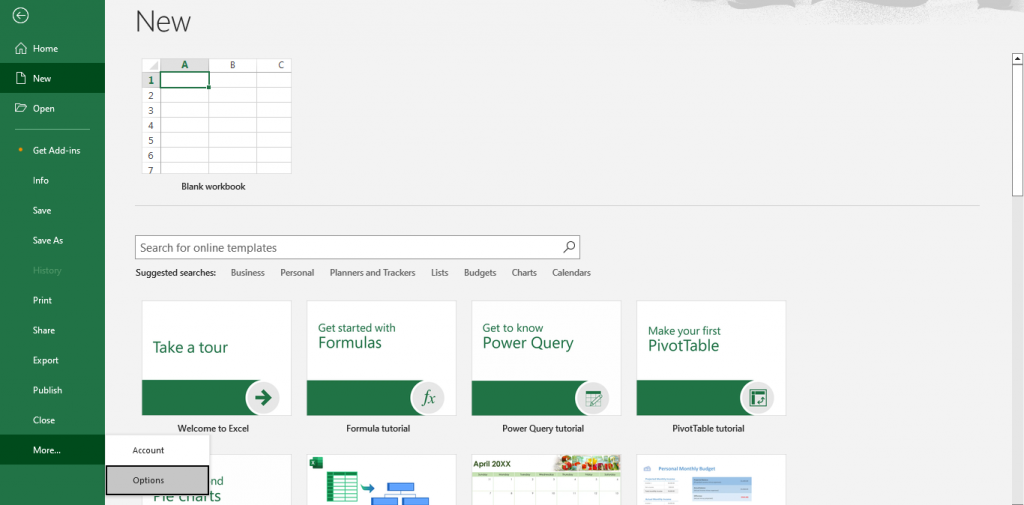 - Click Options at the bottom of the left sidebar to open the Excel Options window.