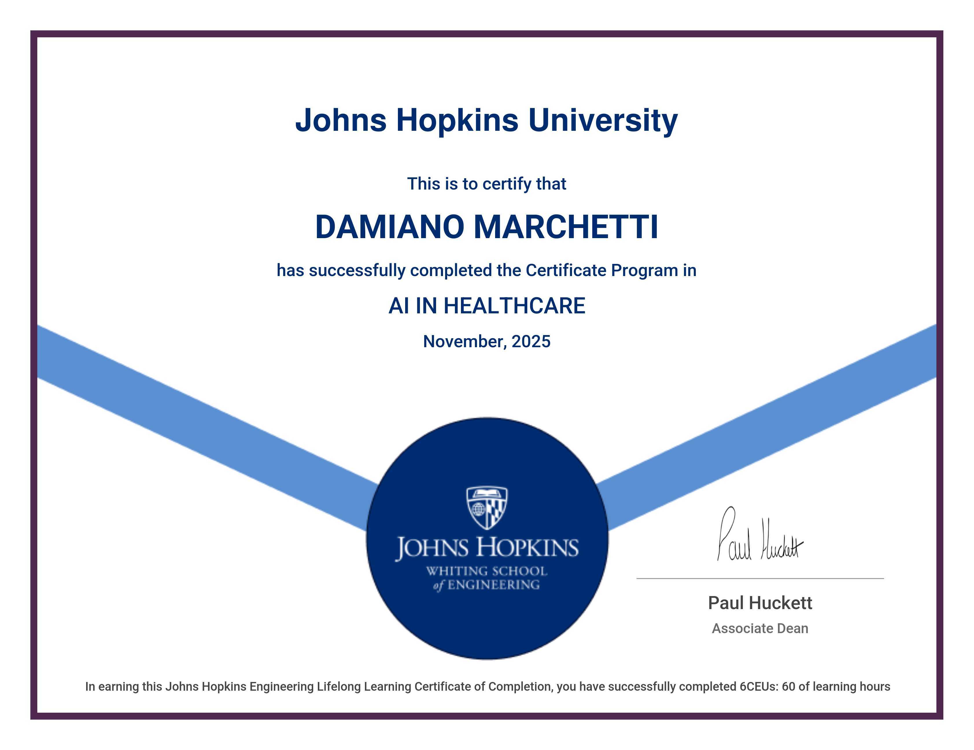 The certificate below verifies that DAMIANO MARCHETTI has completed the AI IN HEALTHCARE