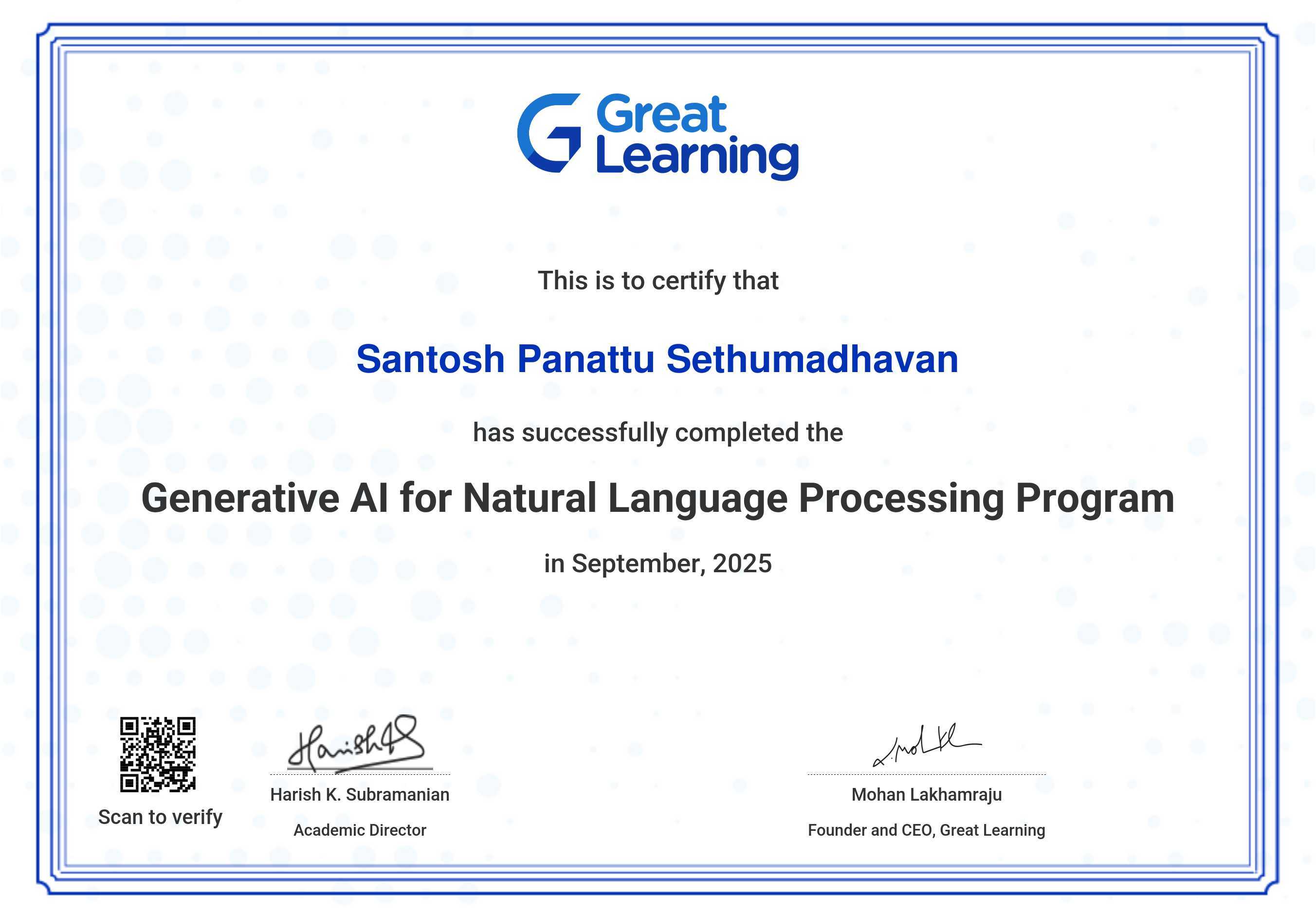 The certificate below verifies that SANTOSH PANATTU SETHUMADHAVAN has completed the GENERATIVE AI for NATURAL LANGUAGE PROCESSING PROGRAM