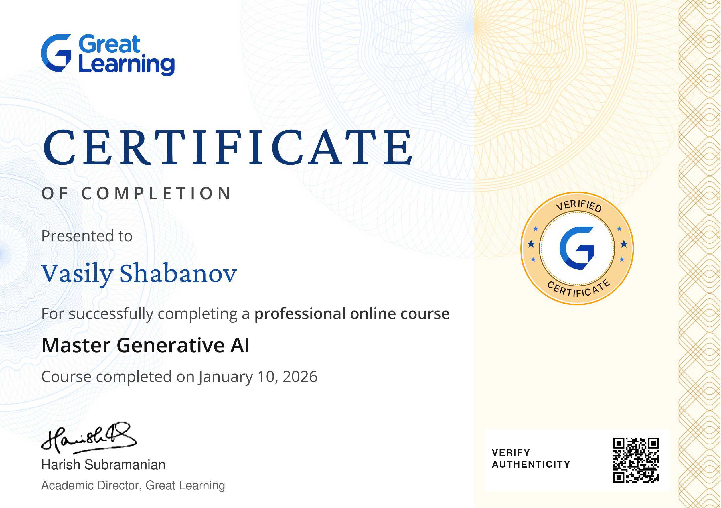 The certificate above verifies that Vasily Shabanov has successfully completed the course Master Generative AI