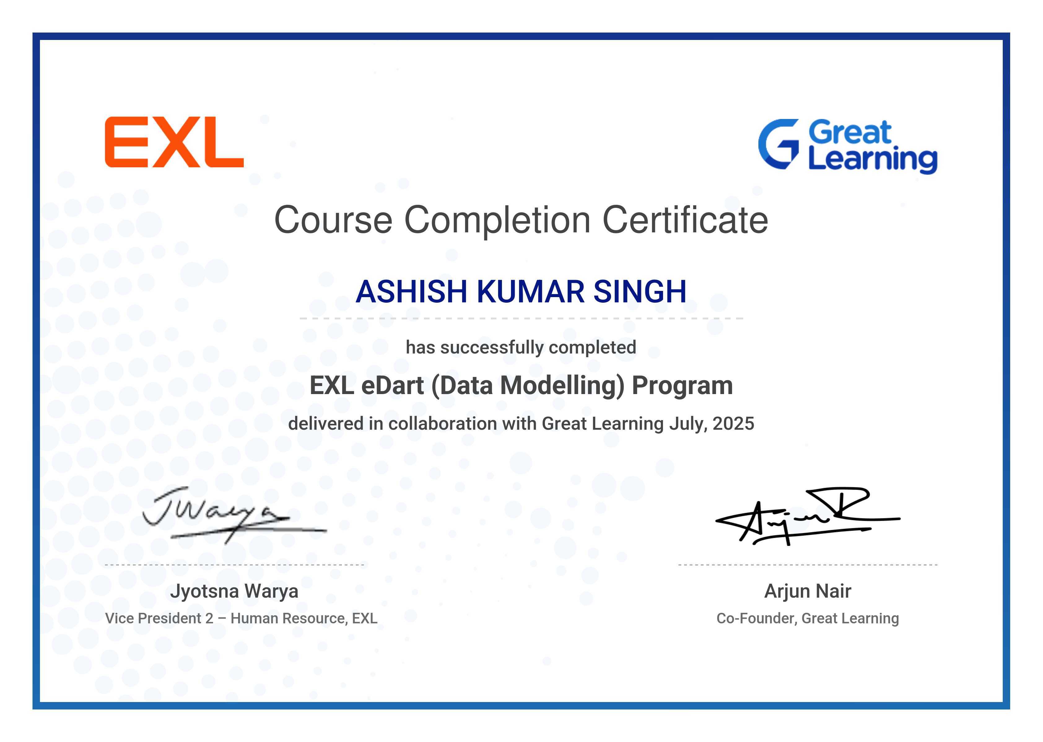 The certificate below verifies that ASHISH KUMAR SINGH has completed the EXL - eDart (DATA MODELLING) Program