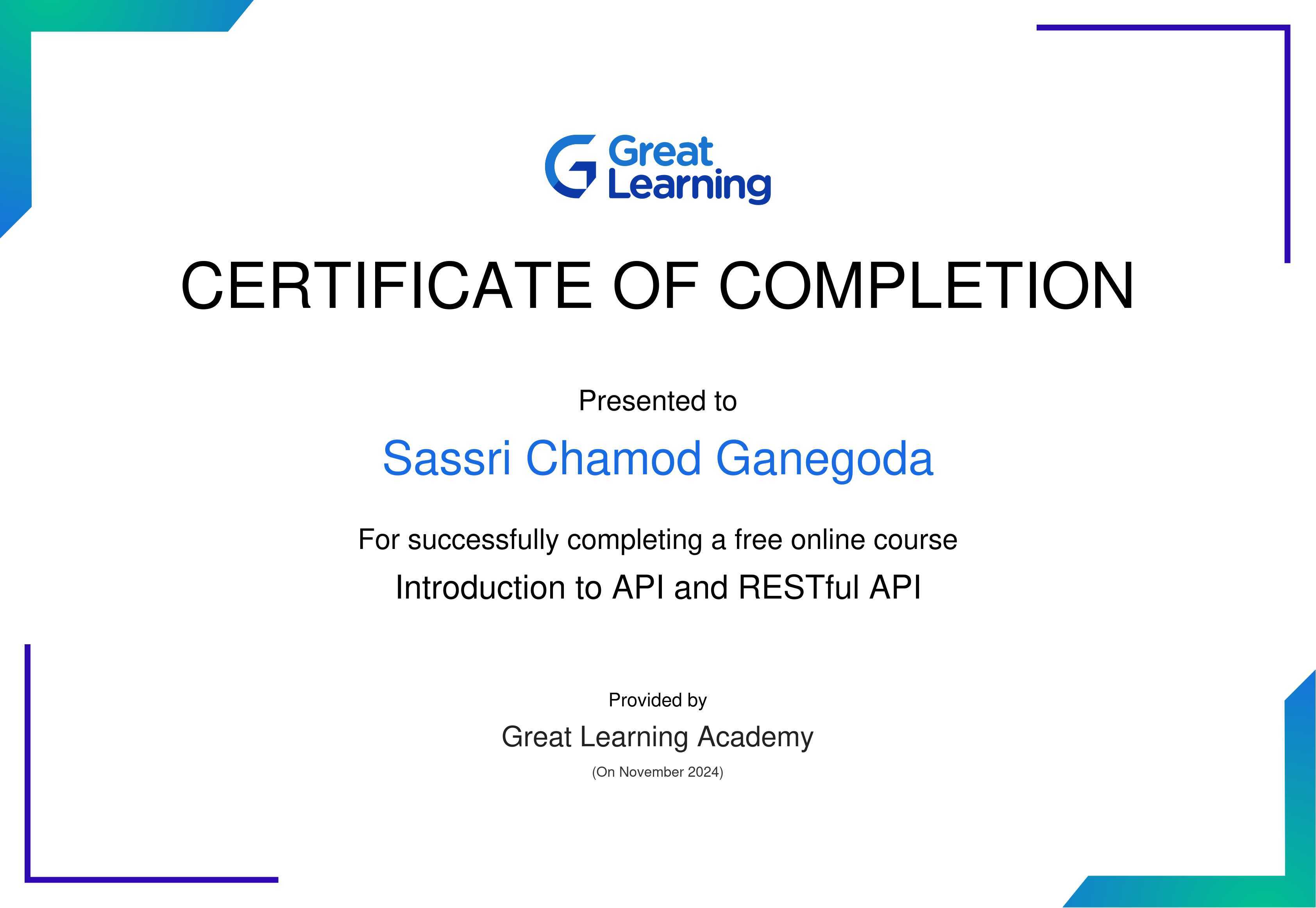The certificate above verifies that Sassri Chamod Ganegoda has successfully completed the course Introduction to API and RESTful API