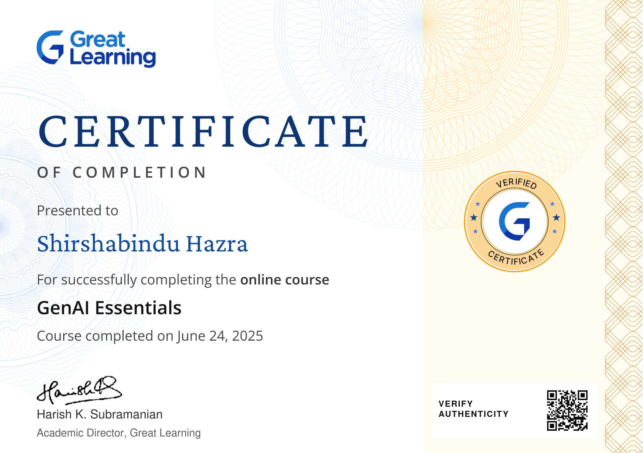 The certificate above verifies that Shirshabindu Hazra has successfully completed the course GenAI Essentials
