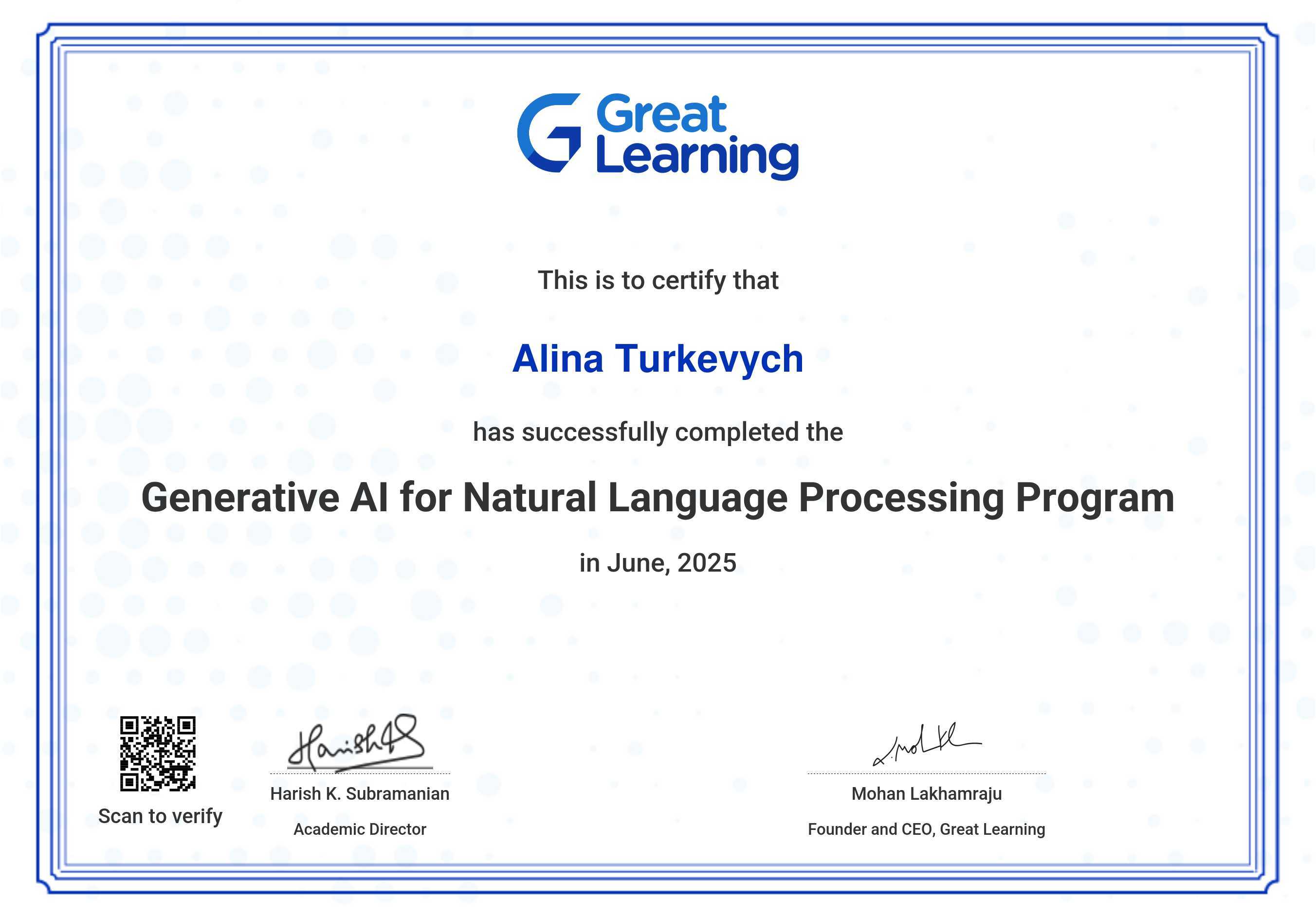 The certificate below verifies that ALINA TURKEVYCH has completed the GENERATIVE AI for NATURAL LANGUAGE PROCESSING PROGRAM