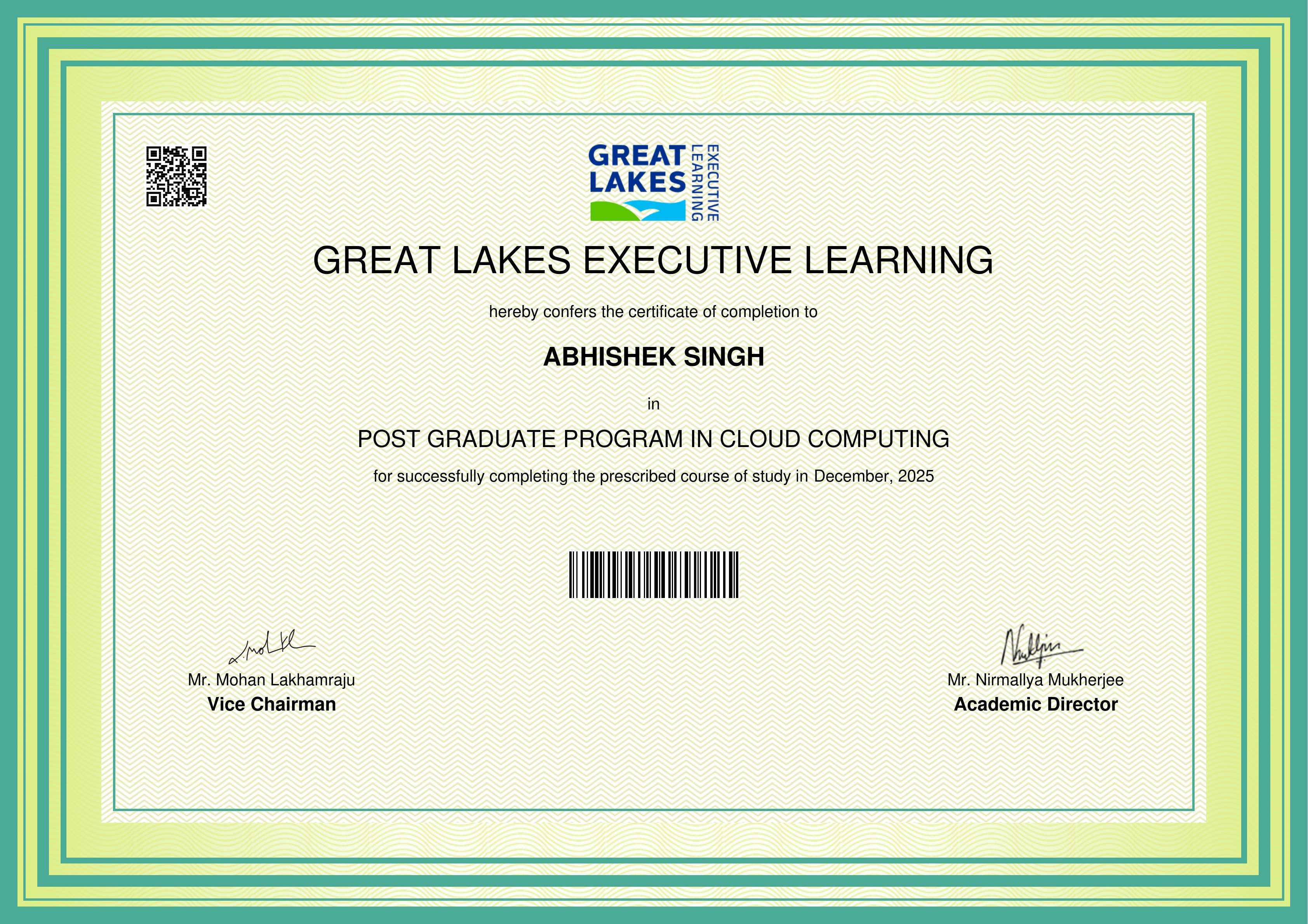 The certificate below verifies that ABHISHEK SINGH has completed the POST GRADUATE PROGRAM IN CLOUD COMPUTING