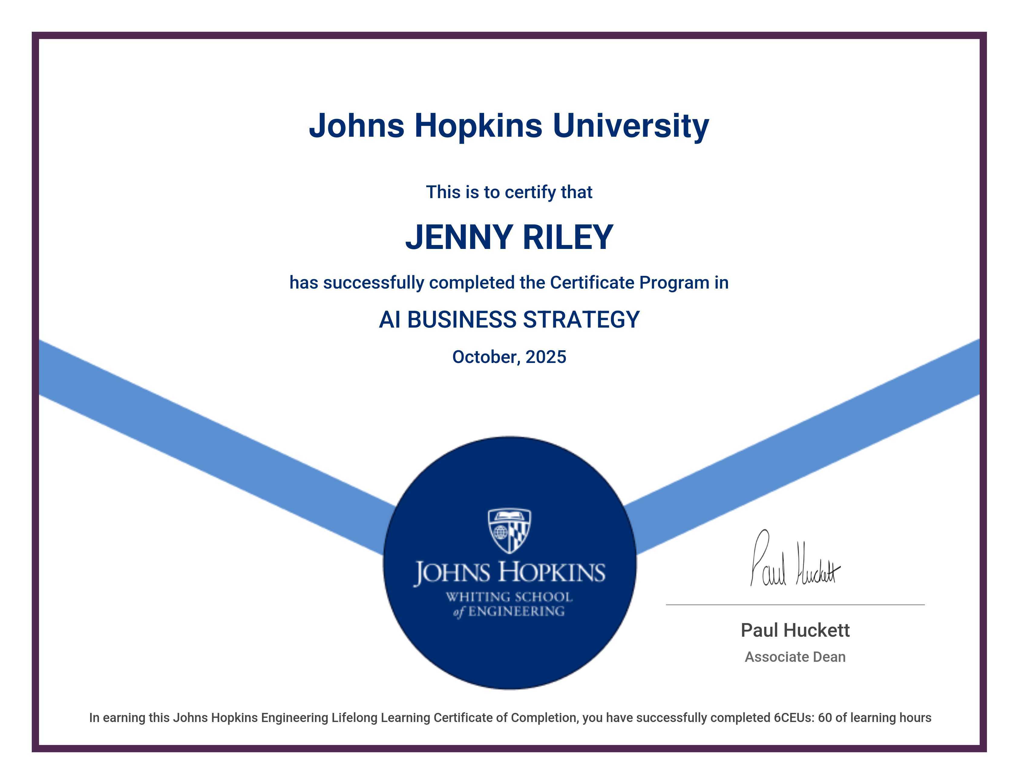The certificate below verifies that JENNY RILEY has completed the AI BUSINESS STRATEGY