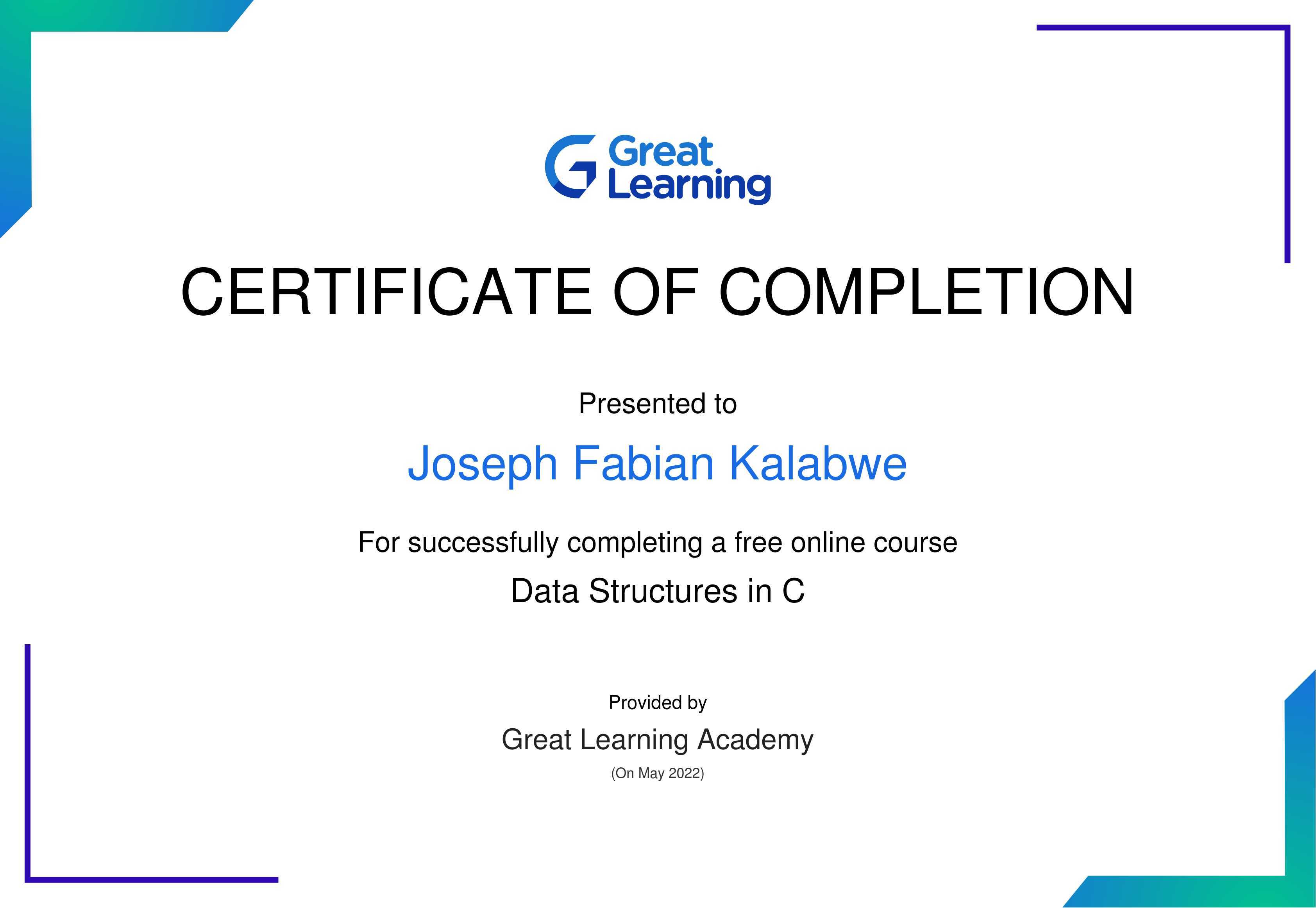 The certificate above verifies that Joseph Fabian Kalabwe has successfully completed the course Data Structures in C