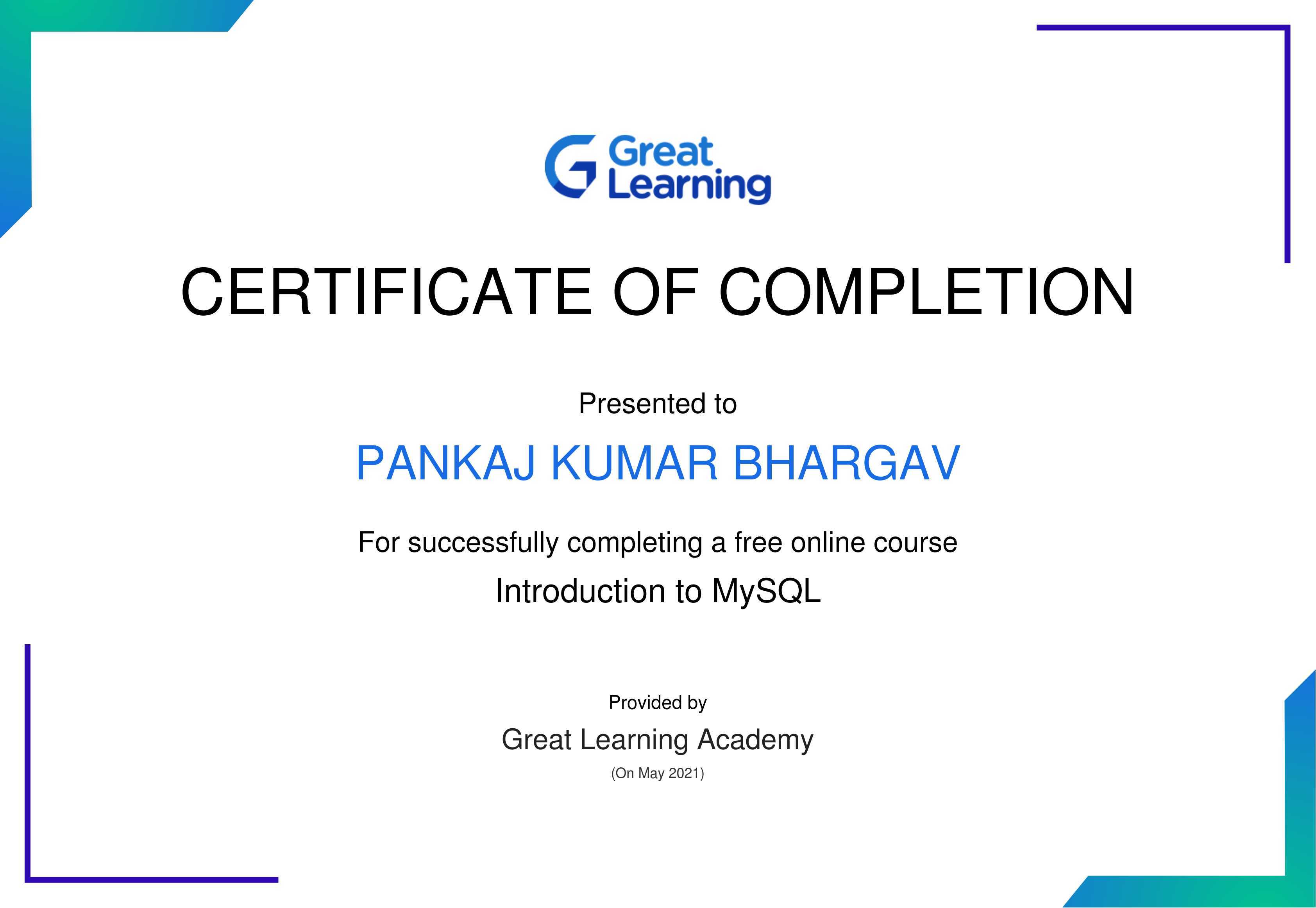 The certificate above verifies that Pankaj Kumar Bhargav has successfully completed the course MySQL Basics in Hindi
