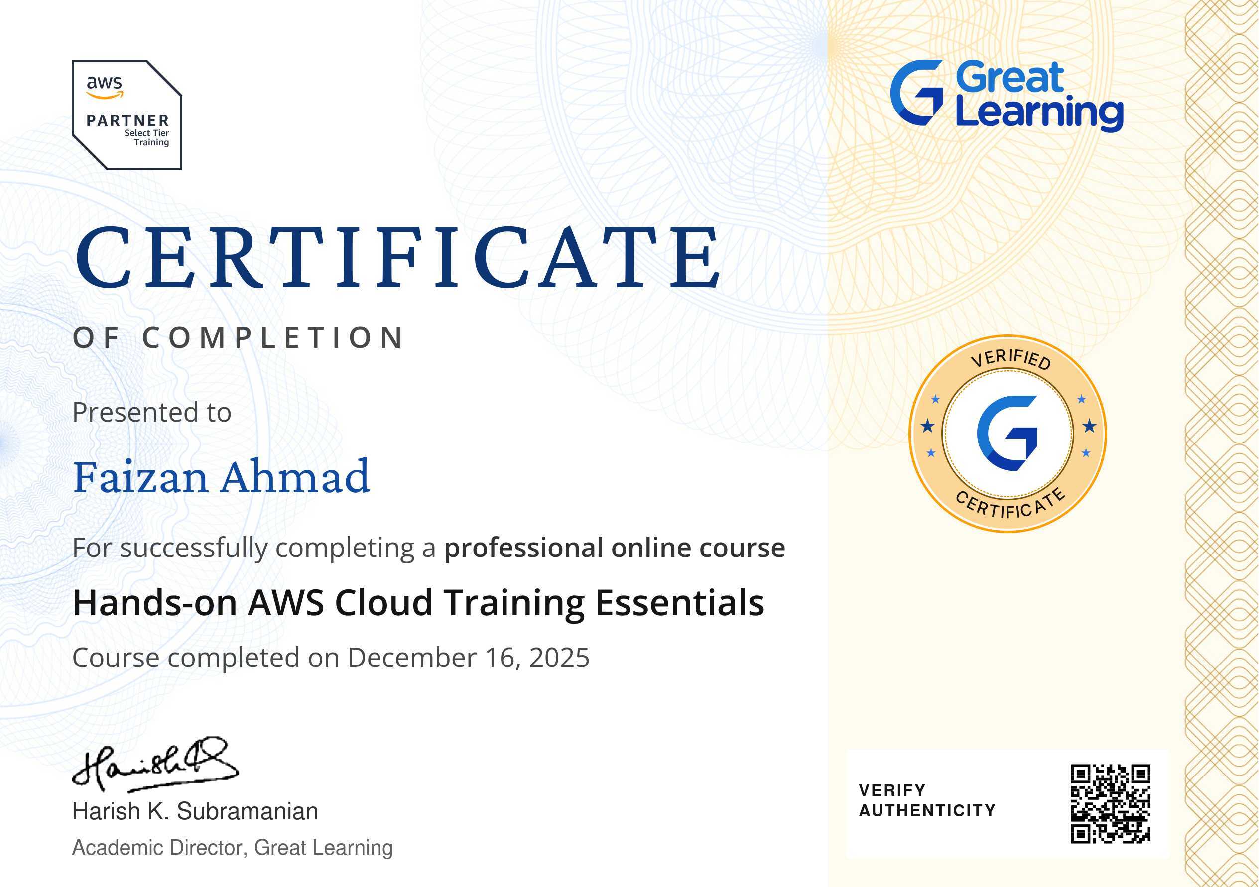 The certificate above verifies that Faizan Ahmad has successfully completed the course Hands-on AWS Cloud Training Essentials