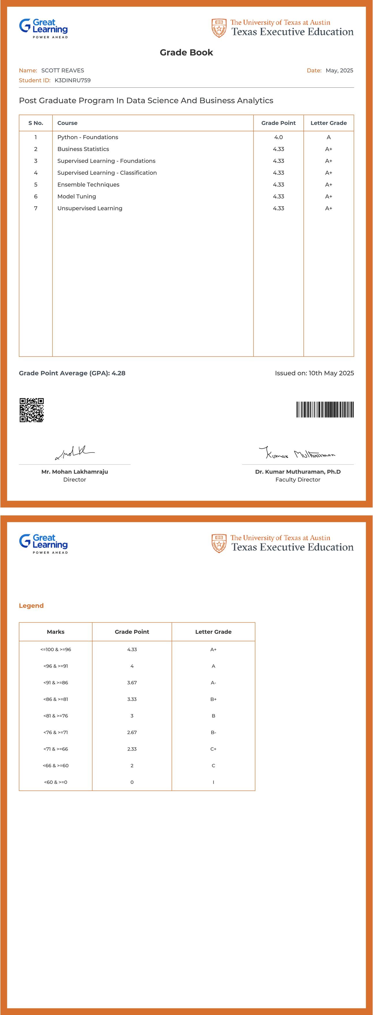 The grade sheet below verifies that SCOTT REAVES has completed the POST GRADUATE PROGRAM IN DATA SCIENCE AND BUSINESS ANALYTICS