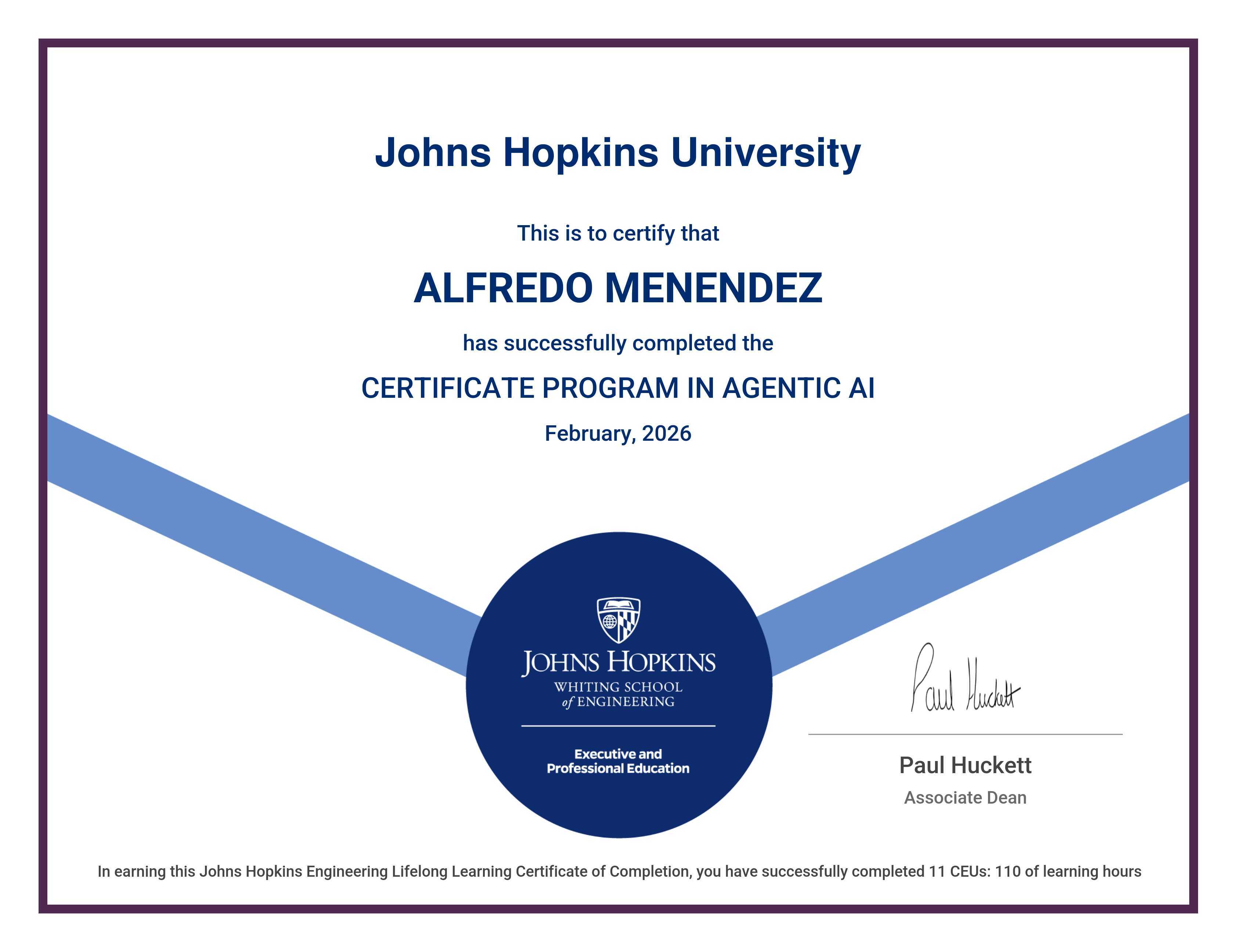 The certificate below verifies that ALFREDO MENENDEZ has completed the CERTIFICATE PROGRAM IN AGENTIC AI