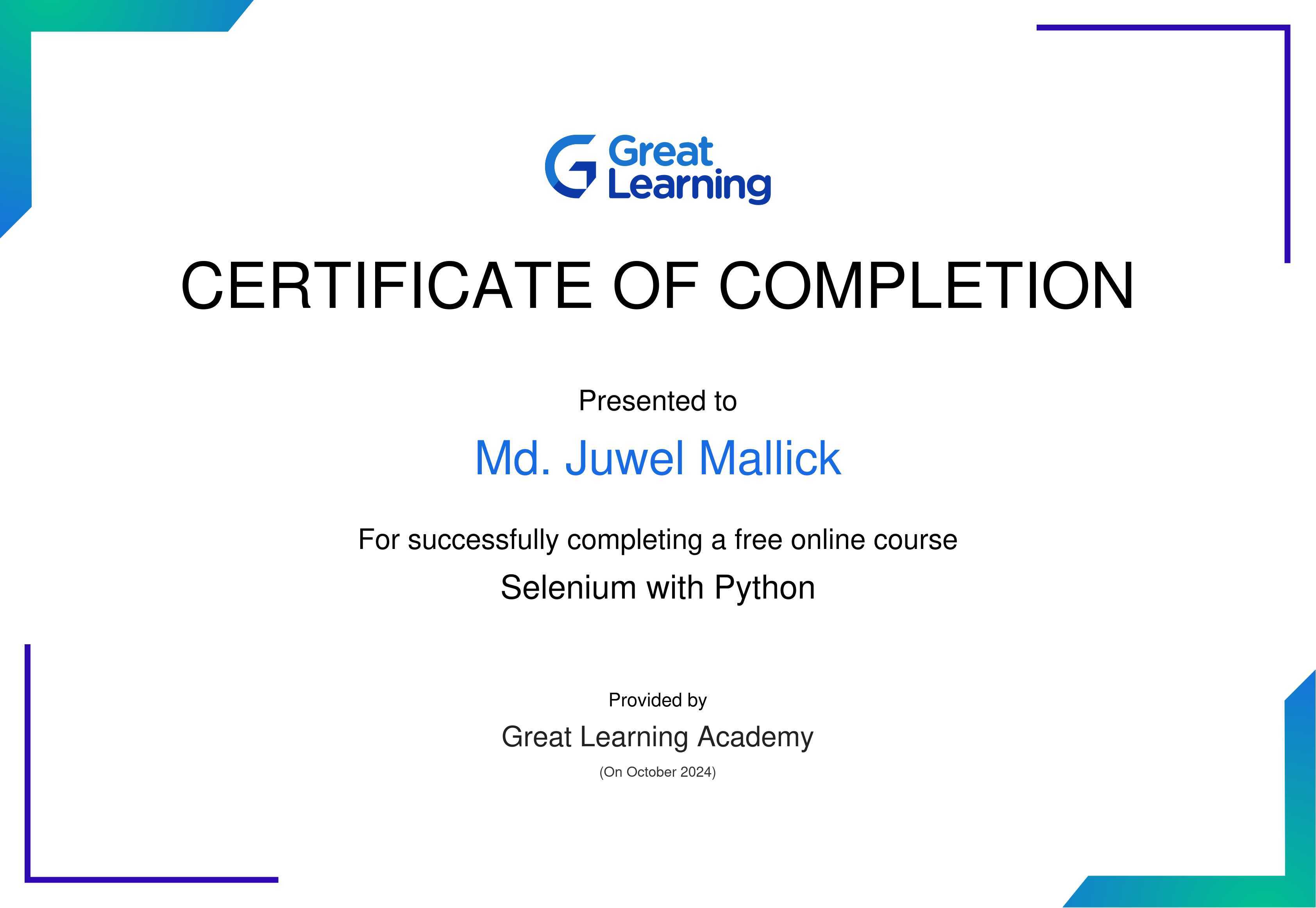 The certificate above verifies that Md. Juwel Mallick has successfully completed the course Selenium with Python