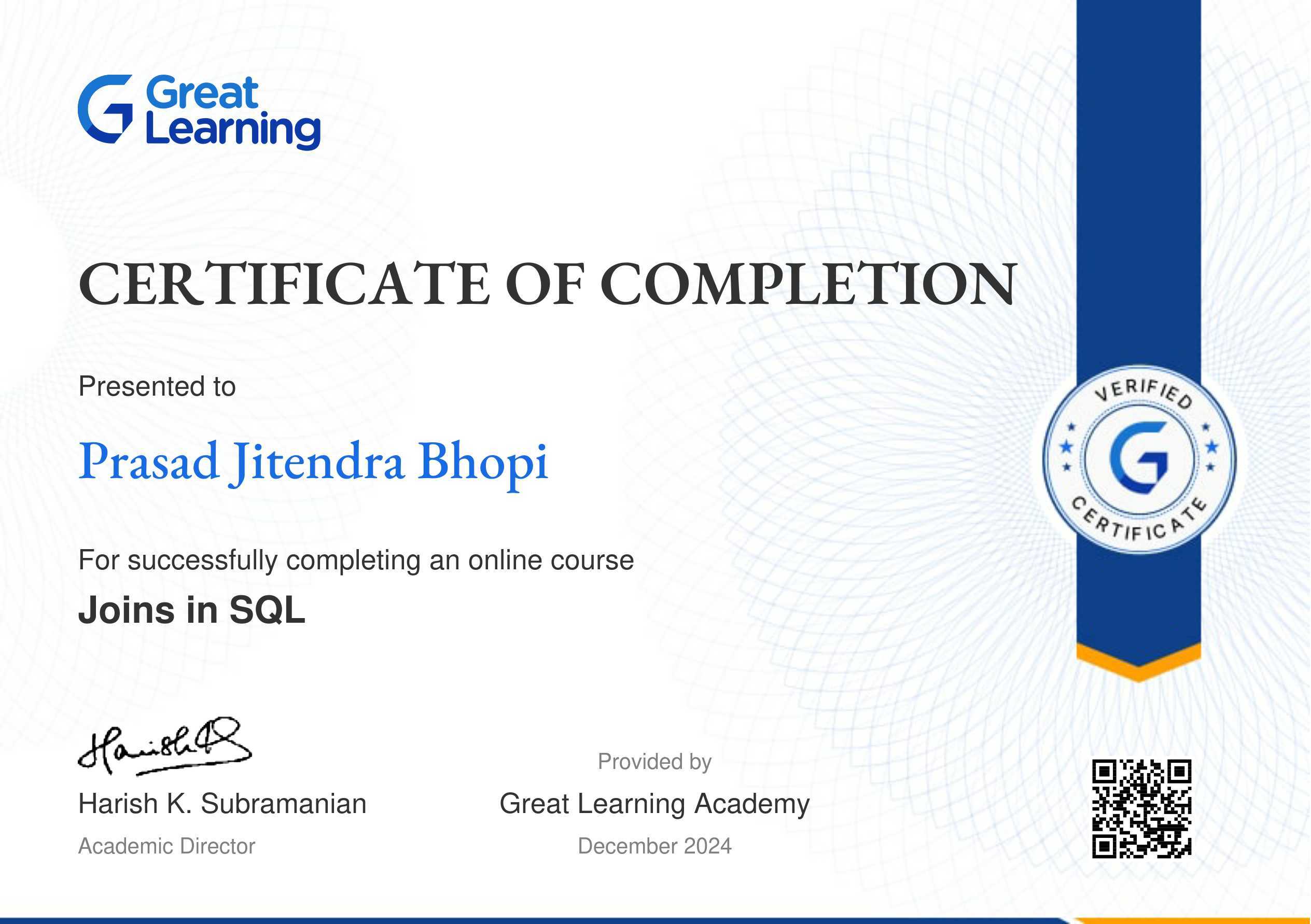 The certificate above verifies that Prasad Jitendra Bhopi has successfully completed the course Joins in SQL
