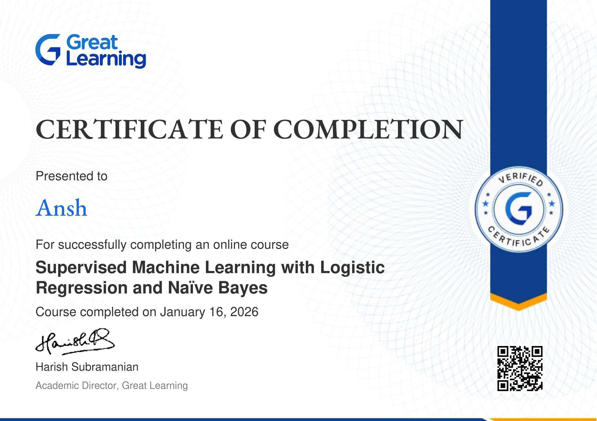 The certificate above verifies that Ansh has successfully completed the course Supervised Machine Learning with Logistic Regression and Naïve Bayes