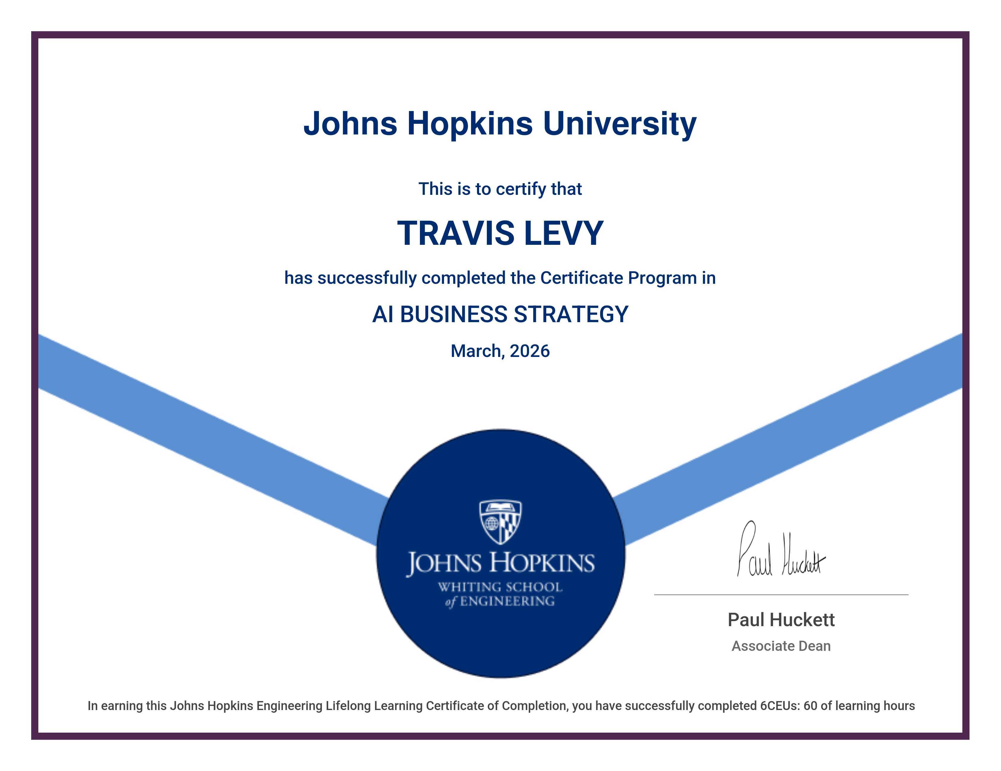 The certificate below verifies that TRAVIS LEVY has completed the AI BUSINESS STRATEGY