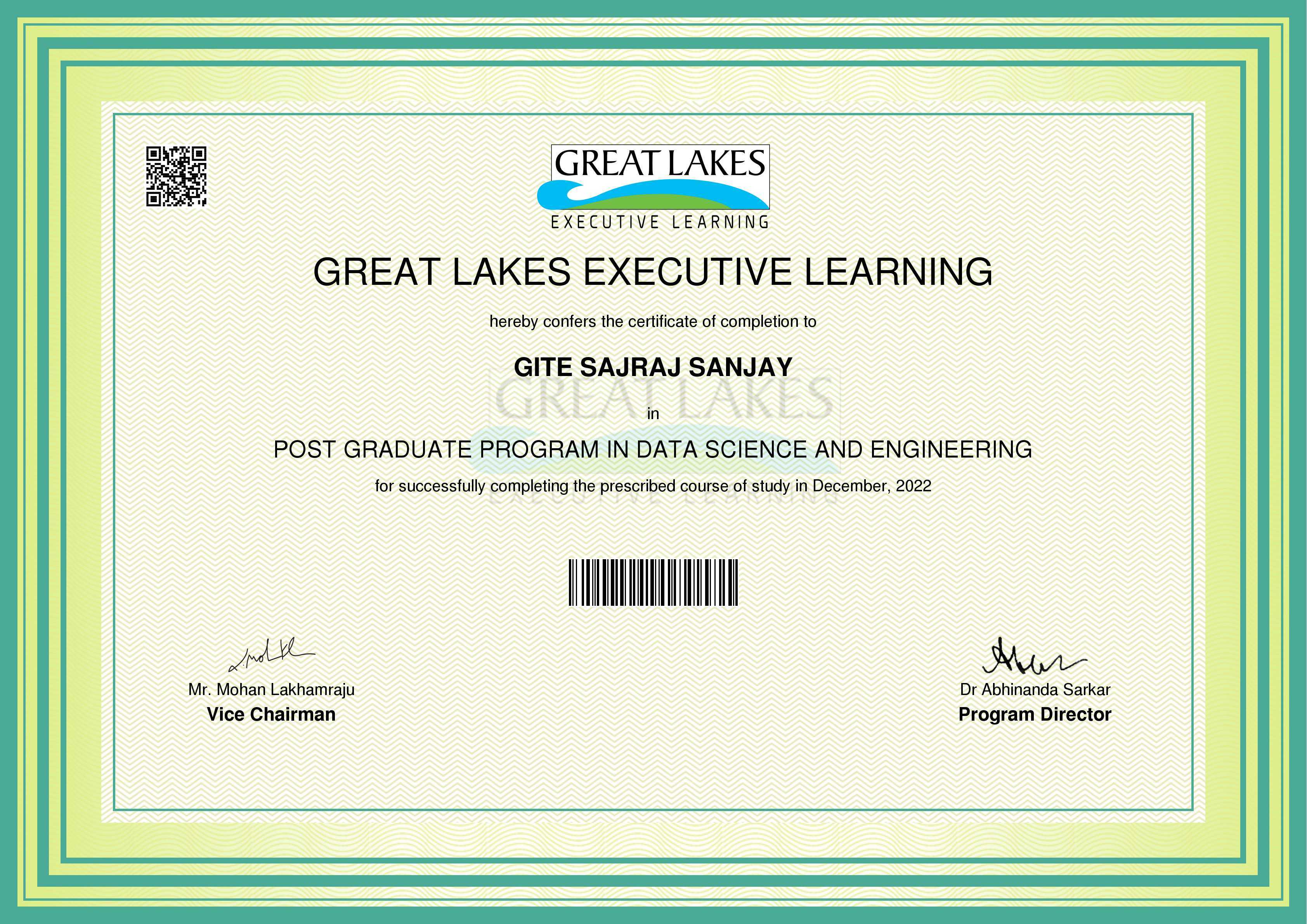 The certificate below verifies that GITE SAJRAJ SANJAY has completed the POST GRADUATE PROGRAM IN DATA SCIENCE AND ENGINEERING