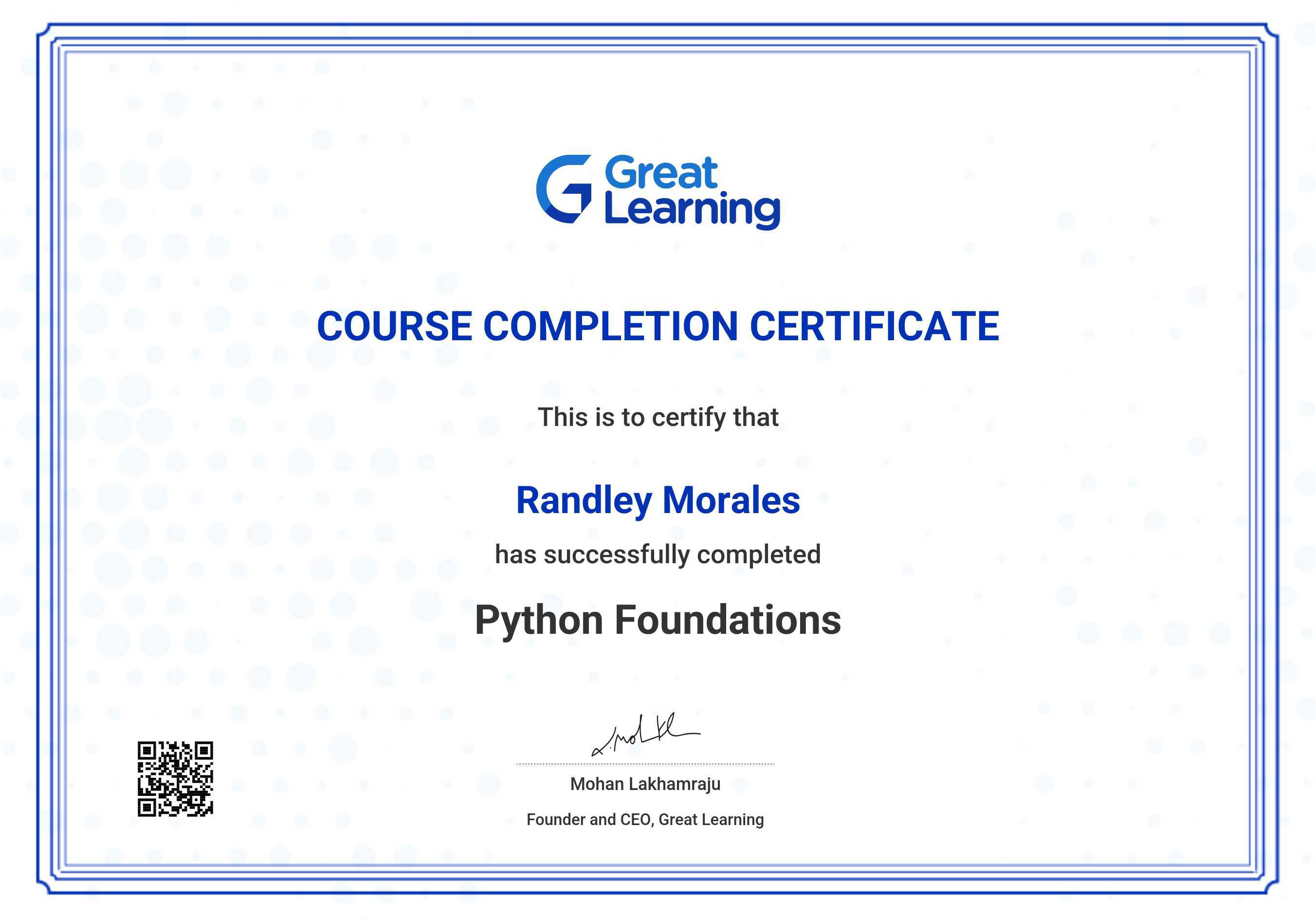 The certificate below verifies that Randley Morales has completed the Python Foundations course