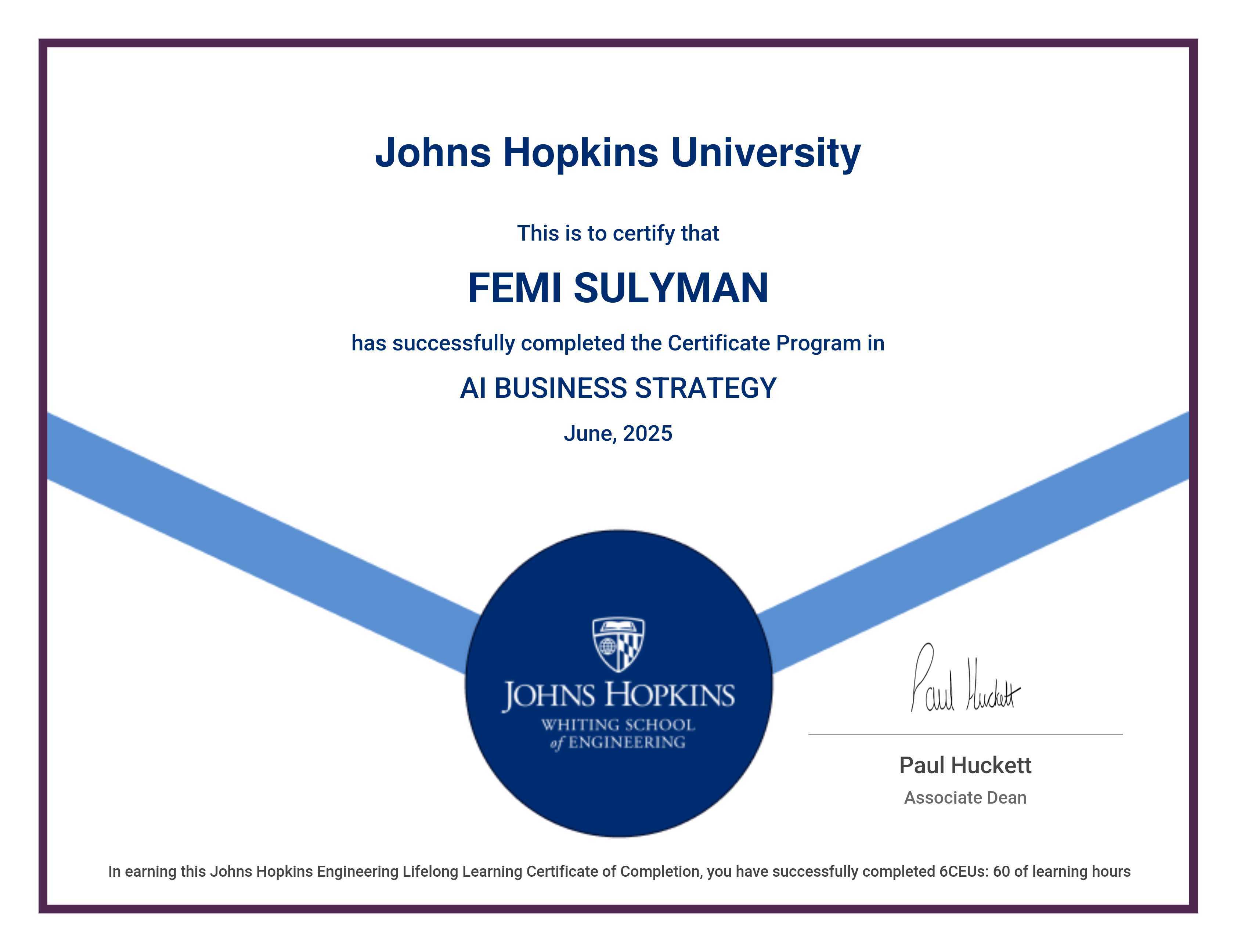 The certificate below verifies that FEMI SULYMAN has completed the AI BUSINESS STRATEGY